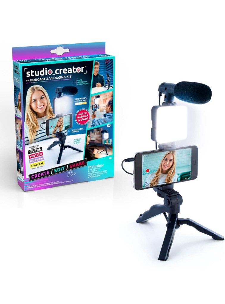Record your podcasts and vlogs like your favorite content creators! This product includes: fold-up tabletop tripod with a smartphone holder, LED light, and microphone.