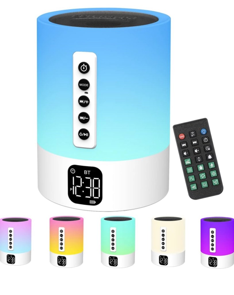 The alarm clock includes a Bluetooth speaker, white noise, 48 different colors, and calendar.