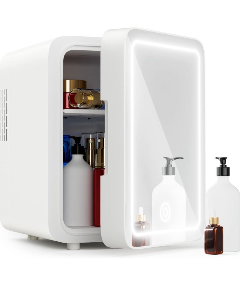 Refrigerate all your skincare to make sure it doesn’t go bad. The outside features a mirror which is perfect for putting on your skincare for the morning and afternoon.